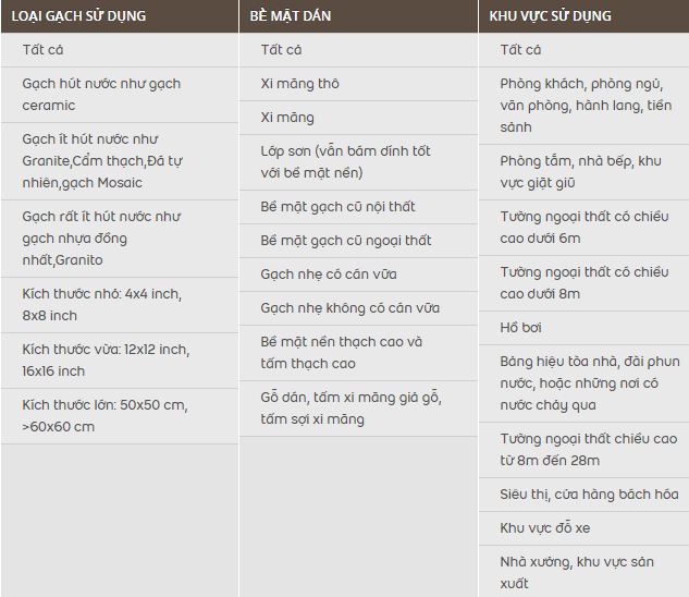 Để chọn được loại keo dán gạch phù hợp cần xác định được 3 yếu tố: loại gạch ốp lát, bề mặt ốp lát, vị trí ốp lát: